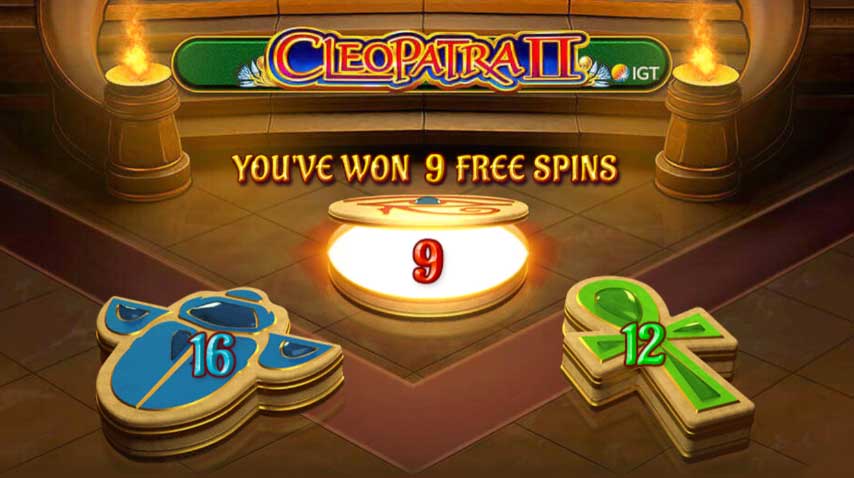 Cleopatra II features a single bonus game: Free Spins with a multiplier. When three or more Sphinx Scatter Symbols land anywhere on the reels, the Free Spins bonus is triggered. The player will then select one of three boxes to reveal the number of Free Spins awarded.